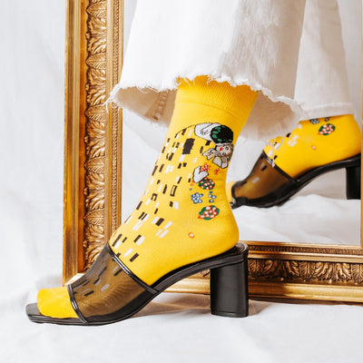 Delfts Blauw Bloemen sokken geïnspireerd op Nederlands porselein, gemaakt van biologisch katoen.Twee mensen dragen de Delfts Blauw Bloemen sokken geïnspireerd op de klassieke ontwerpen van Delfts aardewerk.