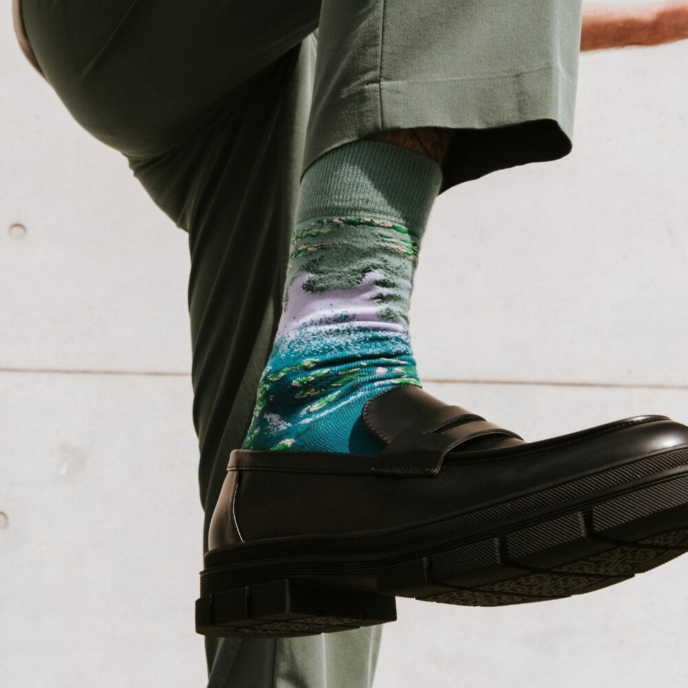 Plongez dans l'univers de Claude Monet avec ces trois chefs-d'œuvre iconiques. Des nymphéas oniriques au lever de soleil impressionniste et à l'élégante femme sous son ombrelle – chaque chaussette fait revivre le jeu unique de lumière et de couleurs de Monet à vos pieds.