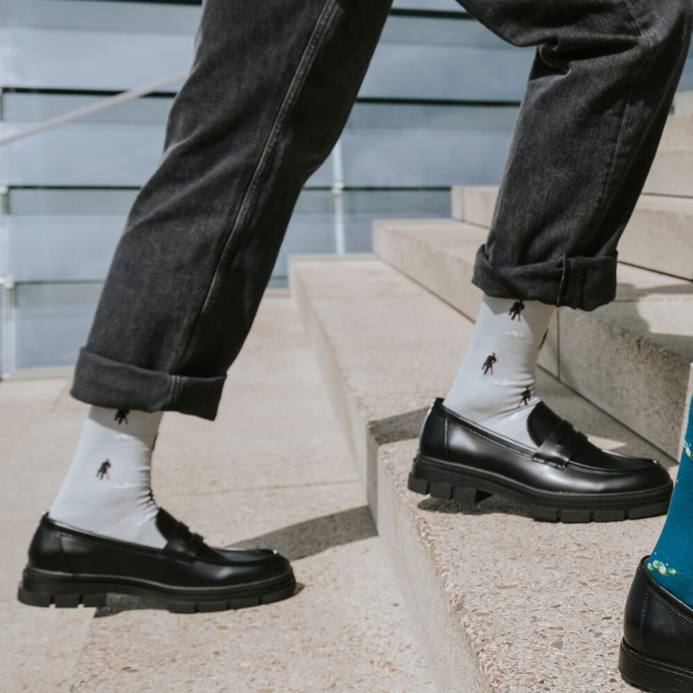 Les œuvres d'art sur nos chaussettes ne sont pas imprimées mais réellement tricotées dans le tissu – ce qui surprend souvent nos clients. Grâce à cette technique, les couleurs conservent leur éclat et leur vivacité lavage après lavage. Même après des dizaines de portées, vos chaussettes resteront aussi vibrantes que le jour de leur achat. Vous pourrez ainsi profiter plus longtemps de l'art à vos pieds !