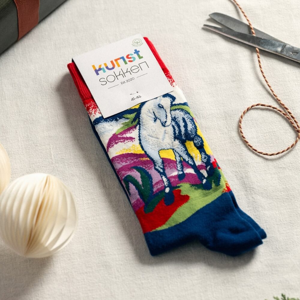 Les œuvres d'art sur nos chaussettes ne sont pas imprimées mais réellement tricotées dans le tissu – ce qui surprend souvent nos clients. Grâce à cette technique, les couleurs conservent leur éclat et leur vivacité lavage après lavage. Même après des dizaines de portées, vos chaussettes resteront aussi vibrantes que le jour de leur achat. Vous pourrez ainsi profiter plus longtemps de l'art à vos pieds !