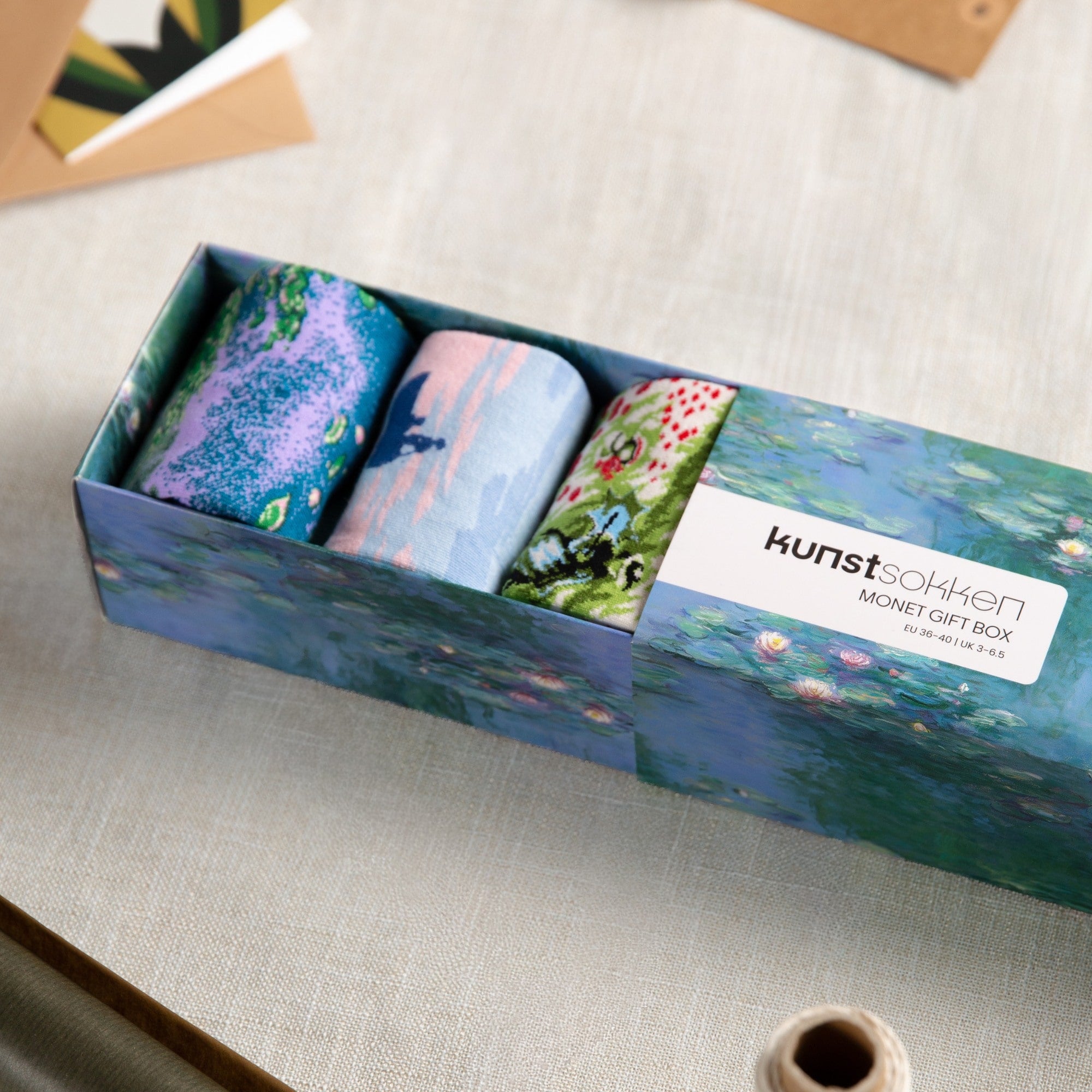 L'emballage est conçu pour rendre hommage à l'art de Monet, avec des détails raffinés qui complètent magnifiquement les chaussettes.