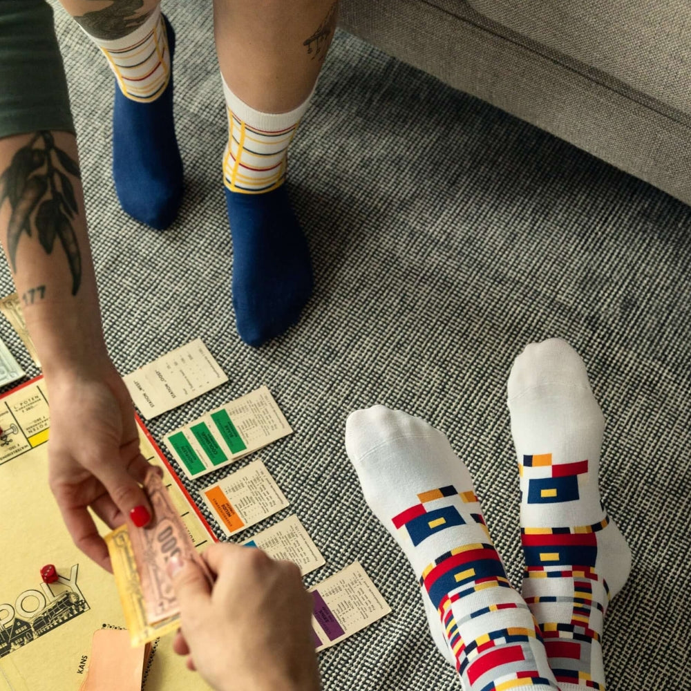 Traversez votre journée avec assurance grâce aux couleurs éclatantes de "New York City I" (1941) de Mondrian. Ces chaussettes en coton biologique insufflent à votre garde-robe l'énergie palpitante de la vision du maître : une alliance parfaite entre créativité et confort absolu.