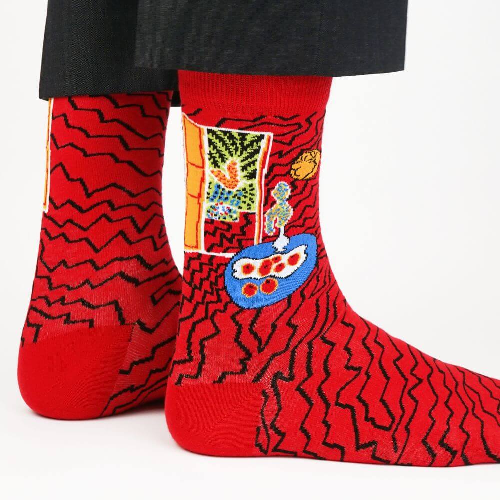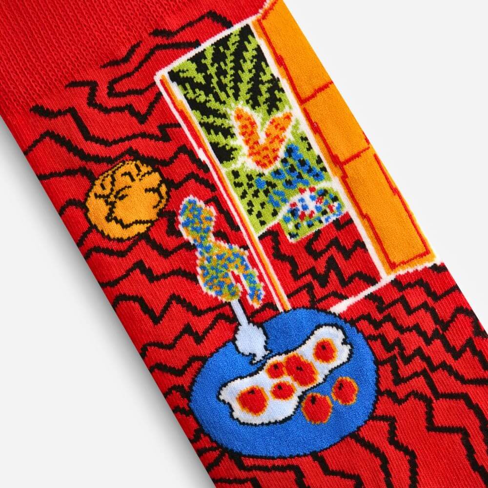 Les œuvres d'art sur nos chaussettes ne sont pas imprimées mais réellement tricotées dans le tissu – ce qui surprend souvent nos clients. Grâce à cette technique, les couleurs conservent leur éclat et leur vivacité lavage après lavage. Même après des dizaines de portées, vos chaussettes resteront aussi vibrantes que le jour de leur achat. Vous pourrez ainsi profiter plus longtemps de l'art à vos pieds !