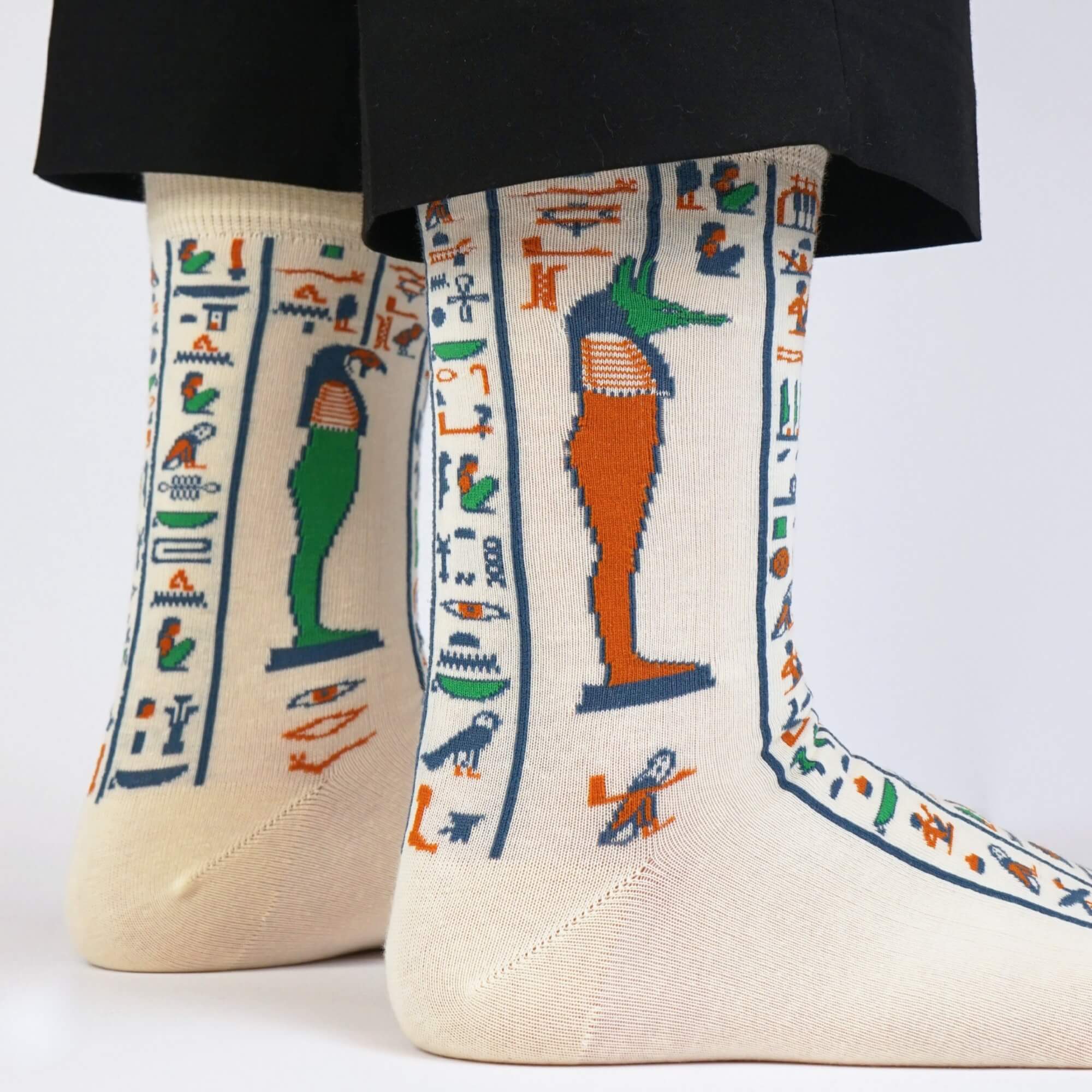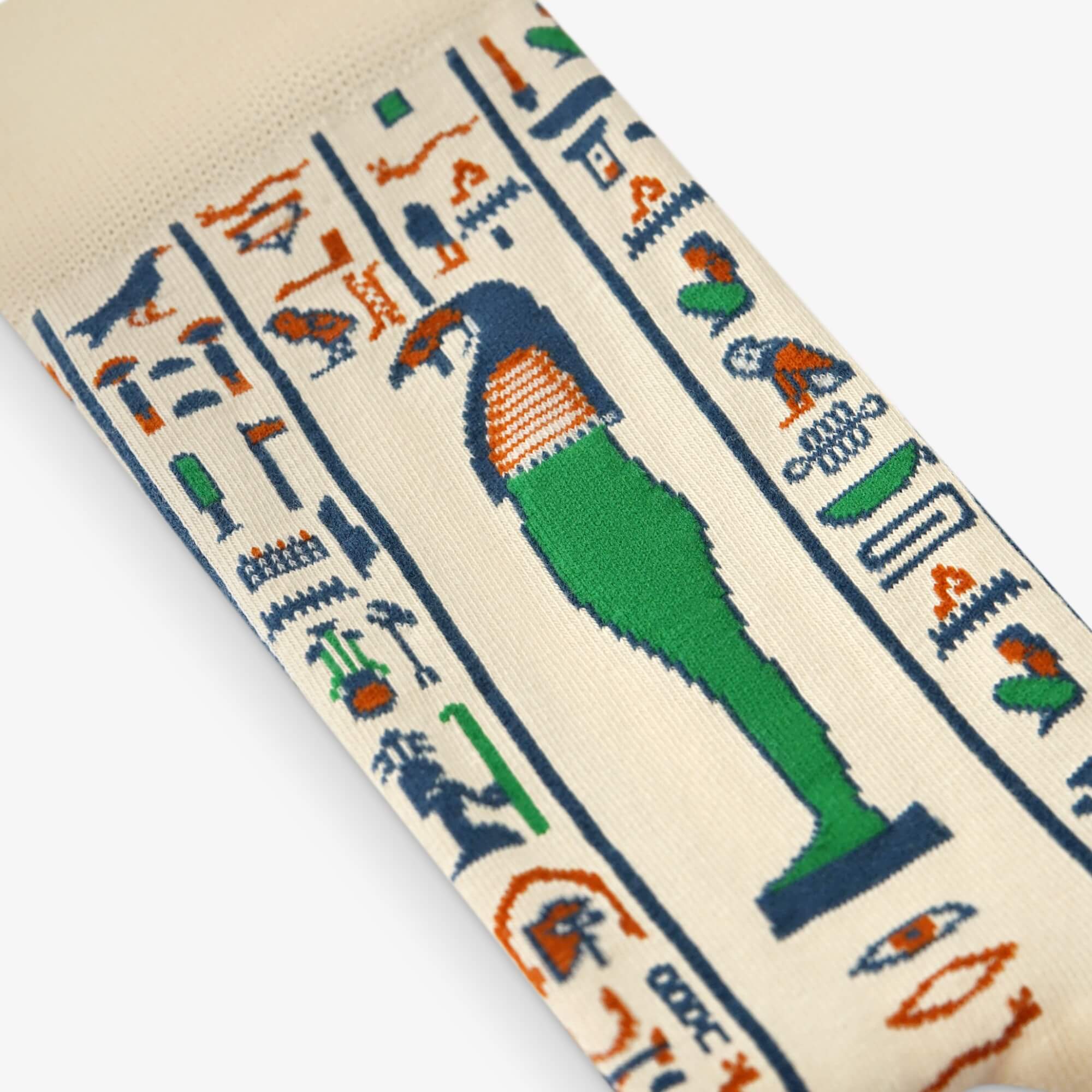 Avec ces chaussettes, vous ne portez pas seulement une magnifique œuvre d'art égyptienne, mais aussi une histoire de protection et de vie éternelle. Chaque couleur et chaque symbole est précisément tricoté dans la chaussette, donnant vie aux détails du cercueil original – des tons bleus et verts vibrants aux hiéroglyphes délicats qui serpentent entre les figures divines.